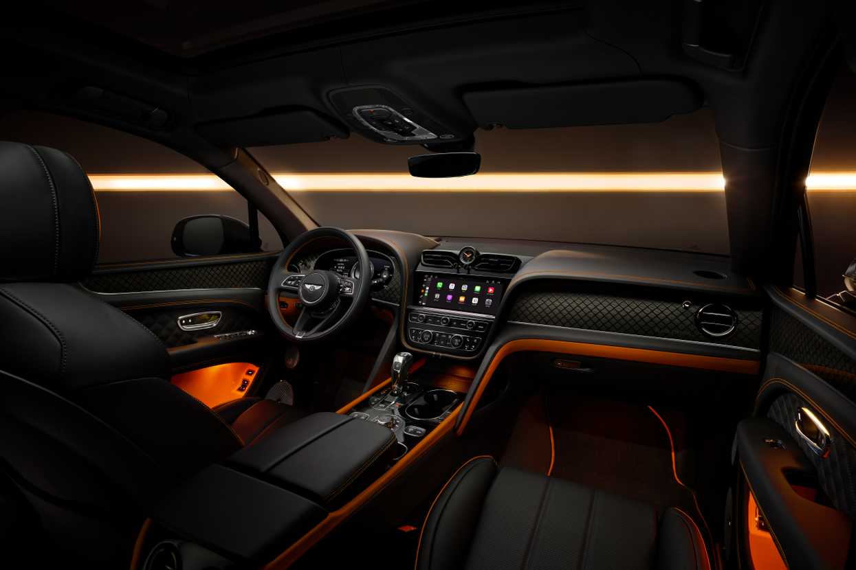 داخل المقصورة، يتباين هذا اللون المميز مع جلد Beluga من خلال الدرزات والأنابيب المتباينة والأجزاء الجلدية ذات الألوان المميزة، في حين تم تزيين ظهور المقاعد بحرف S أسود مطرز. ولكونها من المجموعة الرياضية المتنوعة من Bentayga SUV، فهي مصنوعة من ألياف الكربون الجديدة وقد تم استخدام النسيج في الواجهة، والكونسول الوسطي، وتقليم الأبواب، ويتميز بتأثير بصري ثلاثي الأبعاد لمزيد من العمق والدراما. يتم بعد ذلك ترصيع هذه الزخرفة بشارة الإصدار الأسود، في حالة نسيان الطراز الذي تجلس فيه