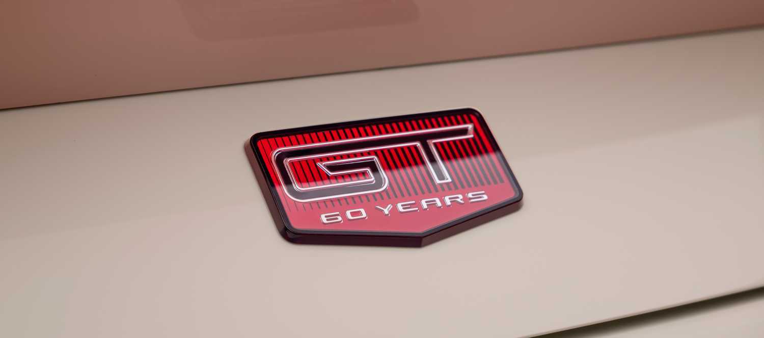 وتحظى الذكرى السنوية الستين بشبكة مميزة ذات تصميم شبكي، في إشارة أخرى إلى سيارة موستانج الأصلية. وتم طلاء فتحات سحب الهواء باللون الفضي لإضفاء مزيد من التباين على الواجهة الأمامية. أضافت فورد أيضًا مصابيح موستانج نايت بوني الأمامية، والتي تبدو أكثر دخانًا من المجموعات القياسية. تحظى السيارات المطلية باللون الأحمر Race Red أو Vapor Blue بأغطية مرايا جانبية باللون الفضي المميز كإشارة رقيقة إلى مرايا الكروم التي كانت شائعة في الستينيات. تحصل سيارات ويمبلدون البيضاء على أغطية مرايا بنفس لون الهيكل. قامت فورد بتركيب نسخة حديثة من شارة موستانج الأصلية على الرفارف وغطاء صندوق الأمتعة. يمكن للعملاء أيضًا اختيار الرسومات الجانبية باللون الفضي Iconic Silver أو Vermillion Red.
