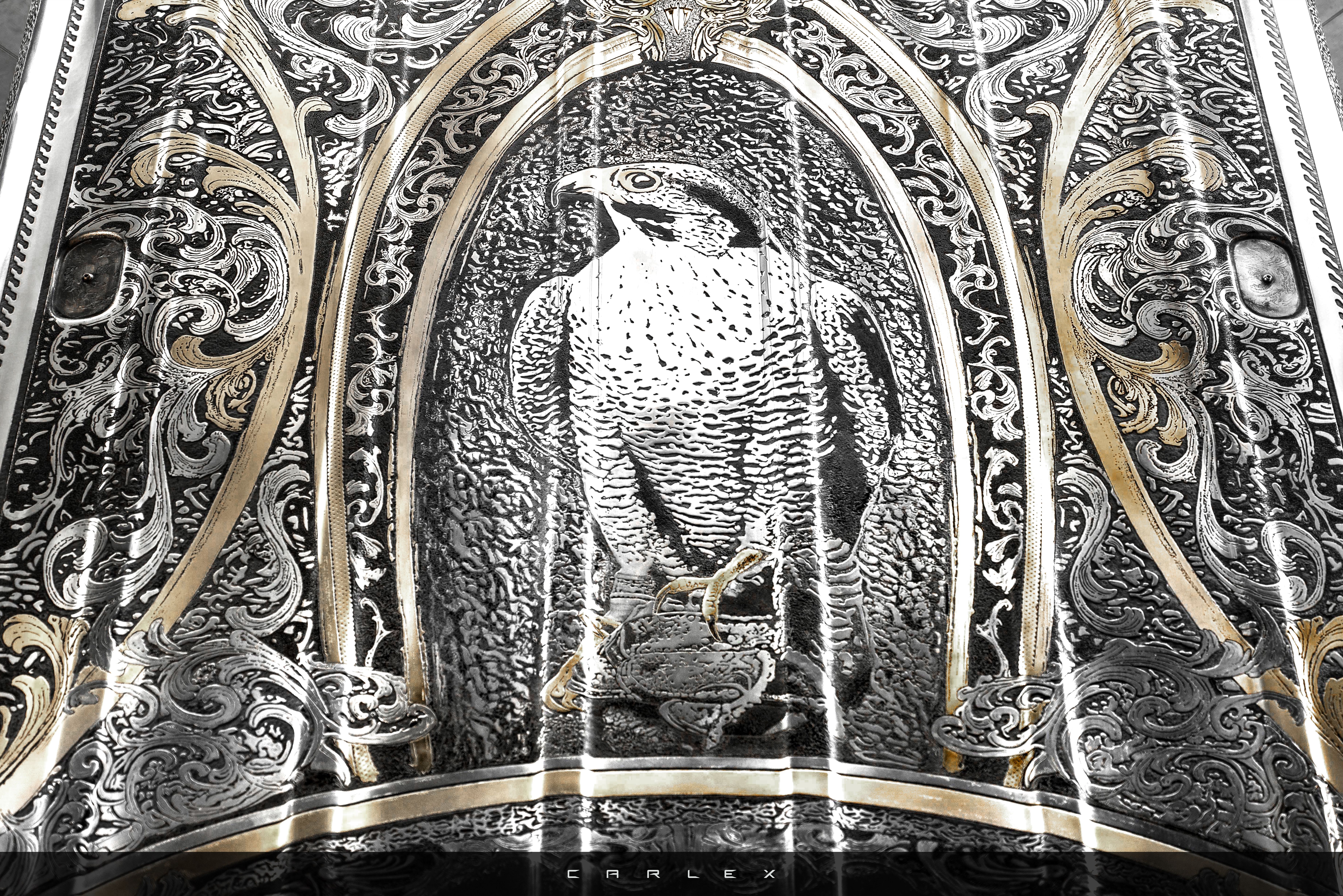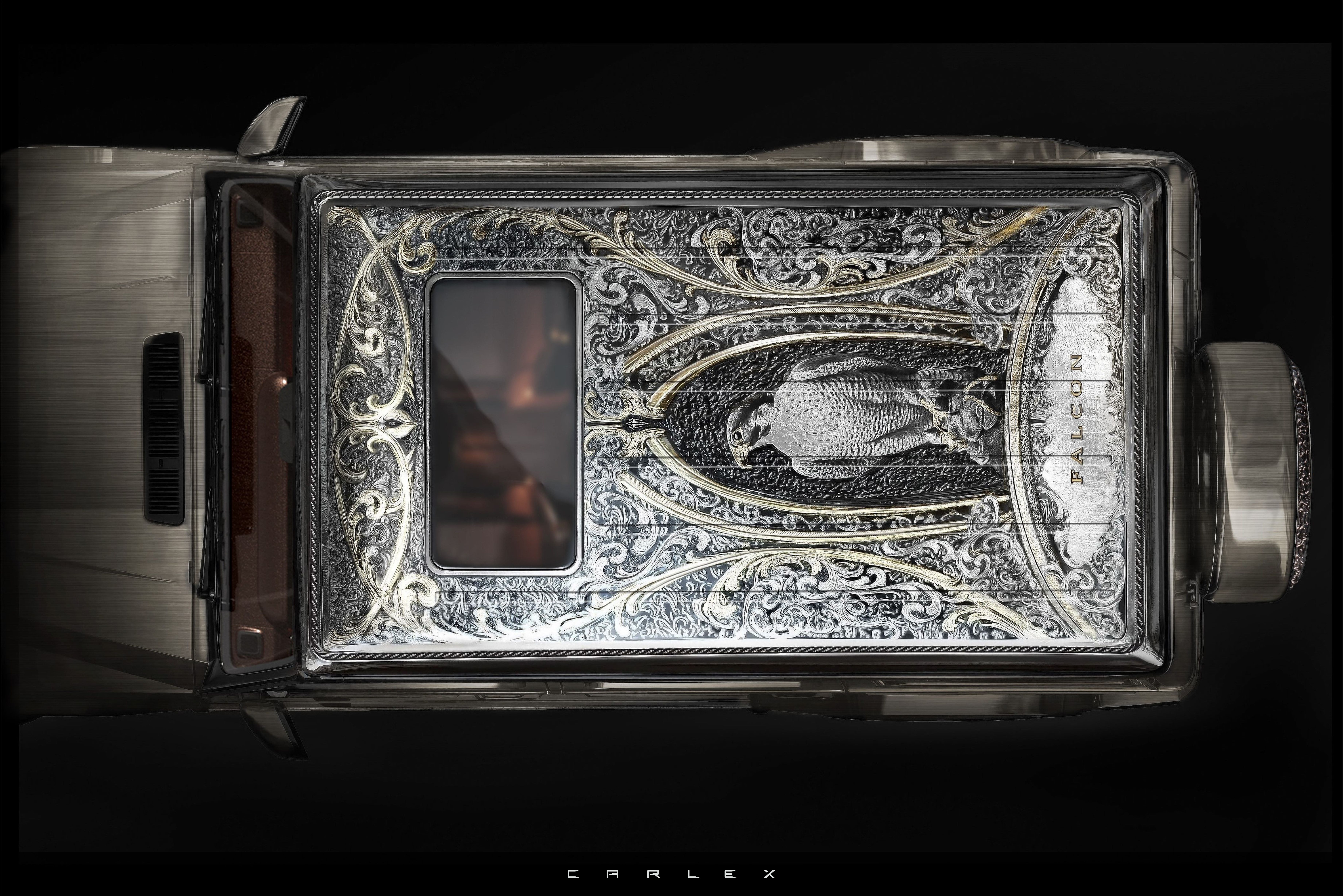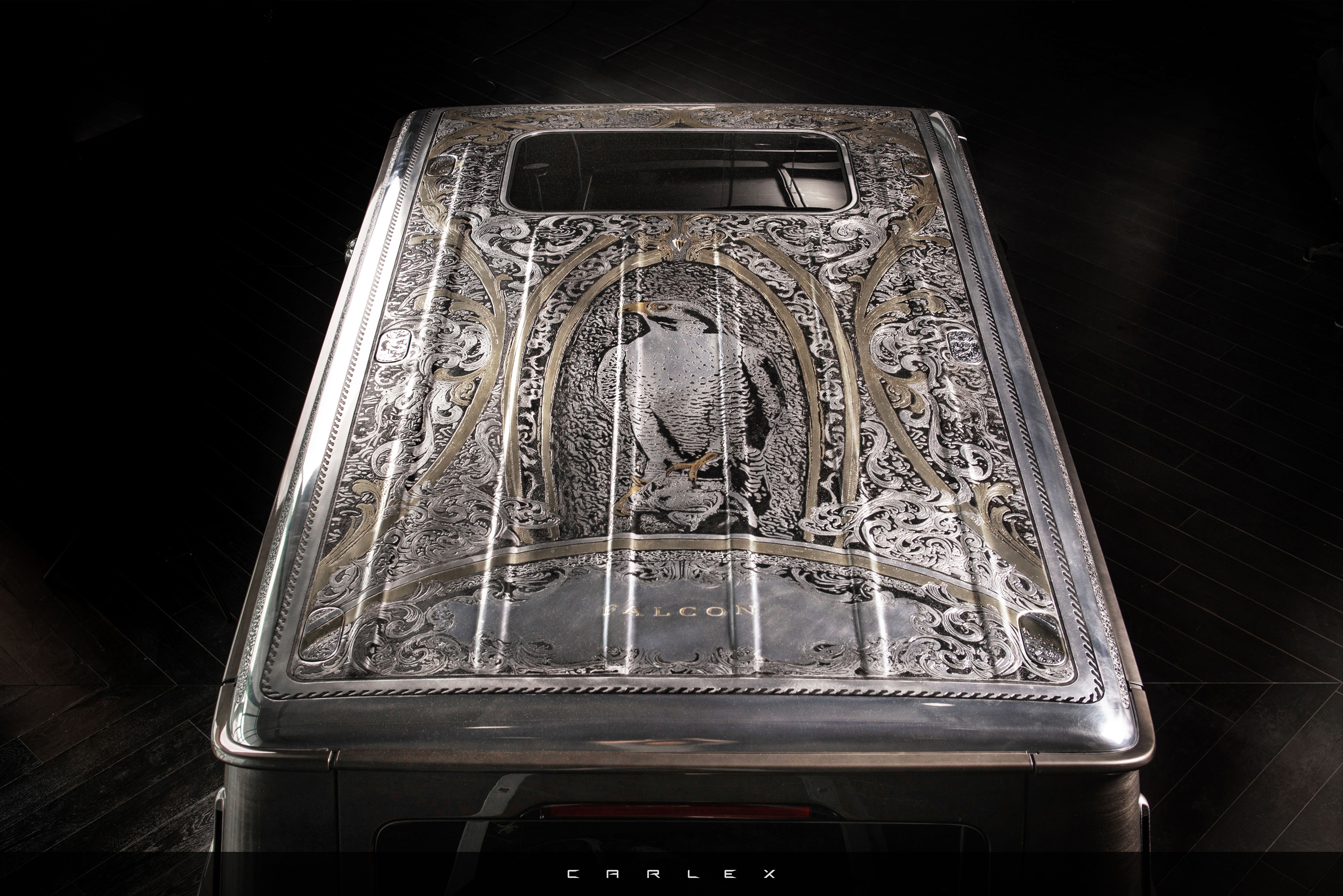 أفضل ميزة لها هي السقف ، الذي يحتوي على صورة رائعة محفورة يدويا لصقر في ما يبدو أنه الغابة. كما يمكن رؤية المزيد من النقش اليدوي على القوالب الجانبية وأقواس العجلات ، والتي تستخدم جميعها أنماطا زخرفية وتباين المعدن المصقول مع لمسات من الذهب تبرز أعمال الطلاء المخصصة. تم تصميم هذه التصميمات ونحتها يدويا ، واستغرقت 36 شهرا لإكمالها ، وأيام عمل كاملة ، وكان لا بد من نحتها جميعا قبل تطبيقها على السيارة.