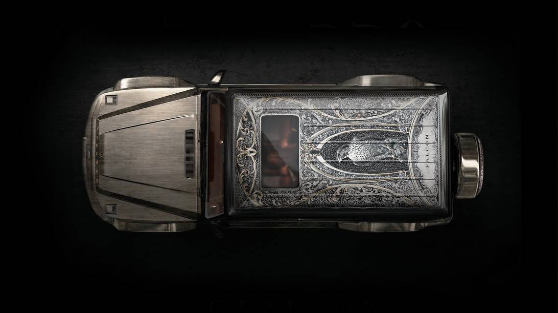 أفضل ميزة لها هي السقف ، الذي يحتوي على صورة رائعة محفورة يدويا لصقر في ما يبدو أنه الغابة. كما يمكن رؤية المزيد من النقش اليدوي على القوالب الجانبية وأقواس العجلات ، والتي تستخدم جميعها أنماطا زخرفية وتباين المعدن المصقول مع لمسات من الذهب تبرز أعمال الطلاء المخصصة. تم تصميم هذه التصميمات ونحتها يدويا ، واستغرقت 36 شهرا لإكمالها ، وأيام عمل كاملة ، وكان لا بد من نحتها جميعا قبل تطبيقها على السيارة.