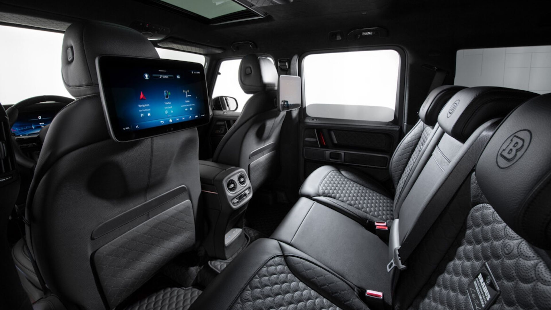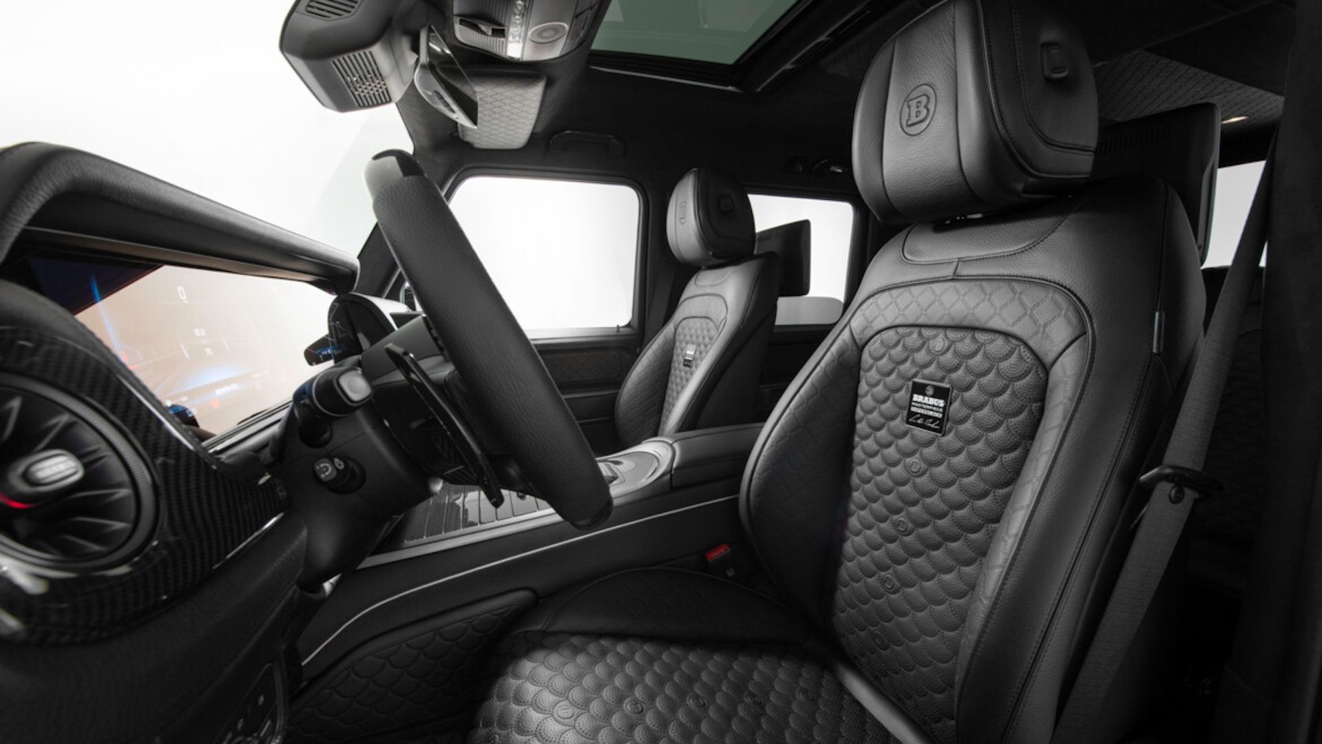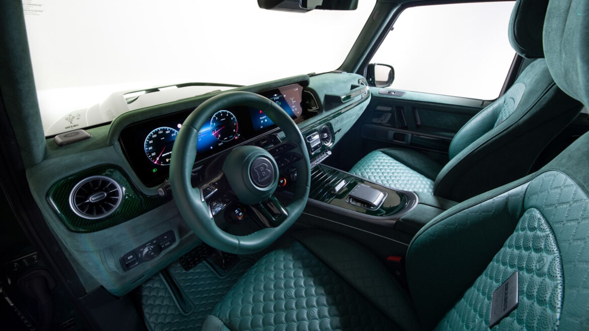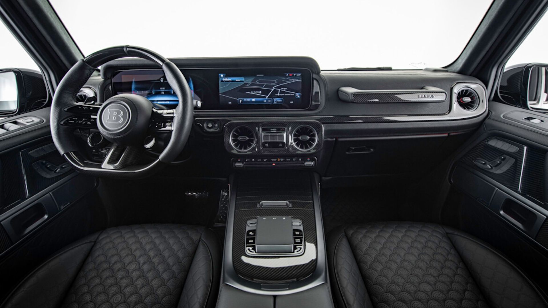 يرتدي التصميم الداخلي ذو اللونين جلدا عالي الجودة وألكانتارا ، وهي مواد من المعروف أن برابوس تستخدمها على نطاق واسع في إبداعاتها. هناك إدخالات من ألياف الكربون على مواد التنجيد أيضا ، بالإضافة إلى مبدلات ودواسات من الألومنيوم وتحسينات أخرى لزيادة جاذبية G63. وفي الوقت نفسه ، يتطابق اللون مع اللون الخارجي المختار ، على الرغم من أن متغير Deep Blue لا يزال يأتي مع سمة سوداء بالكامل.
