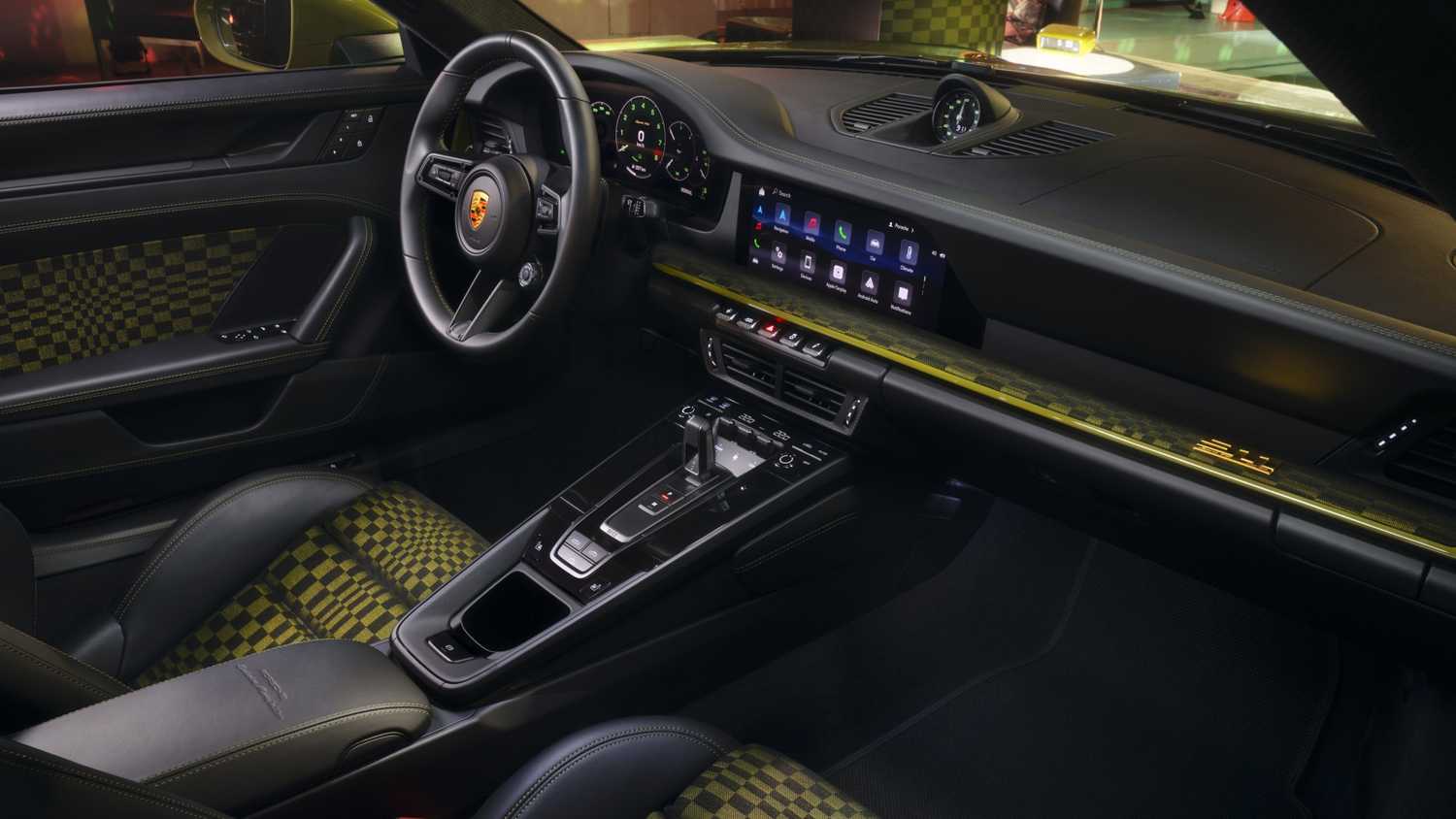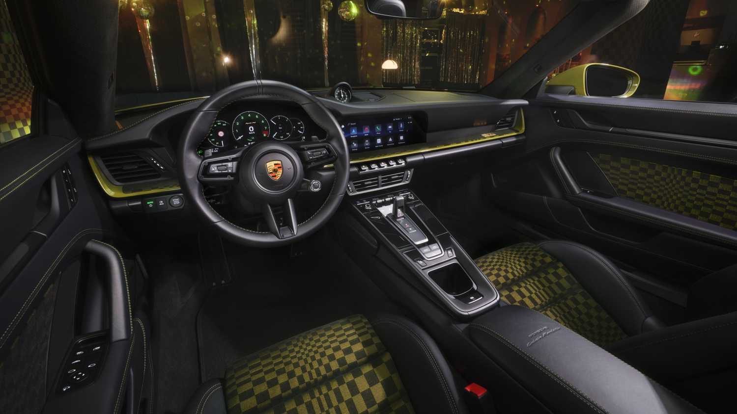 ستقدم بورشه أيضا النمط المميز كخيار مجاني لمساند ظهر المقاعد والديكورات الداخلية. وفي الوقت نفسه ، يتم إعادة تشكيل مجموعة العدادات الرقمية بإبر محاكاة بيضاء وعلامات مقياس ، وتستدعي الأرقام والحروف الخضراء مرة أخرى إلى Porsche G-body. تحذو ساعة توقيت Sport Chrono التناظرية حذوها. وستسمح بورش للأطفال بالاستمتاع بمقعد أطفال قابل للتحويل بطبعة باشا. تتويج الأشياء في الداخل هي شارة 911 مطلية بالذهب على جانب الراكب من لوحة القيادة ، وتبدأ سلسلة المفاتيح المشذبة بالذهب الحفلة التي تبلغ طاقتها 532 حصانا.