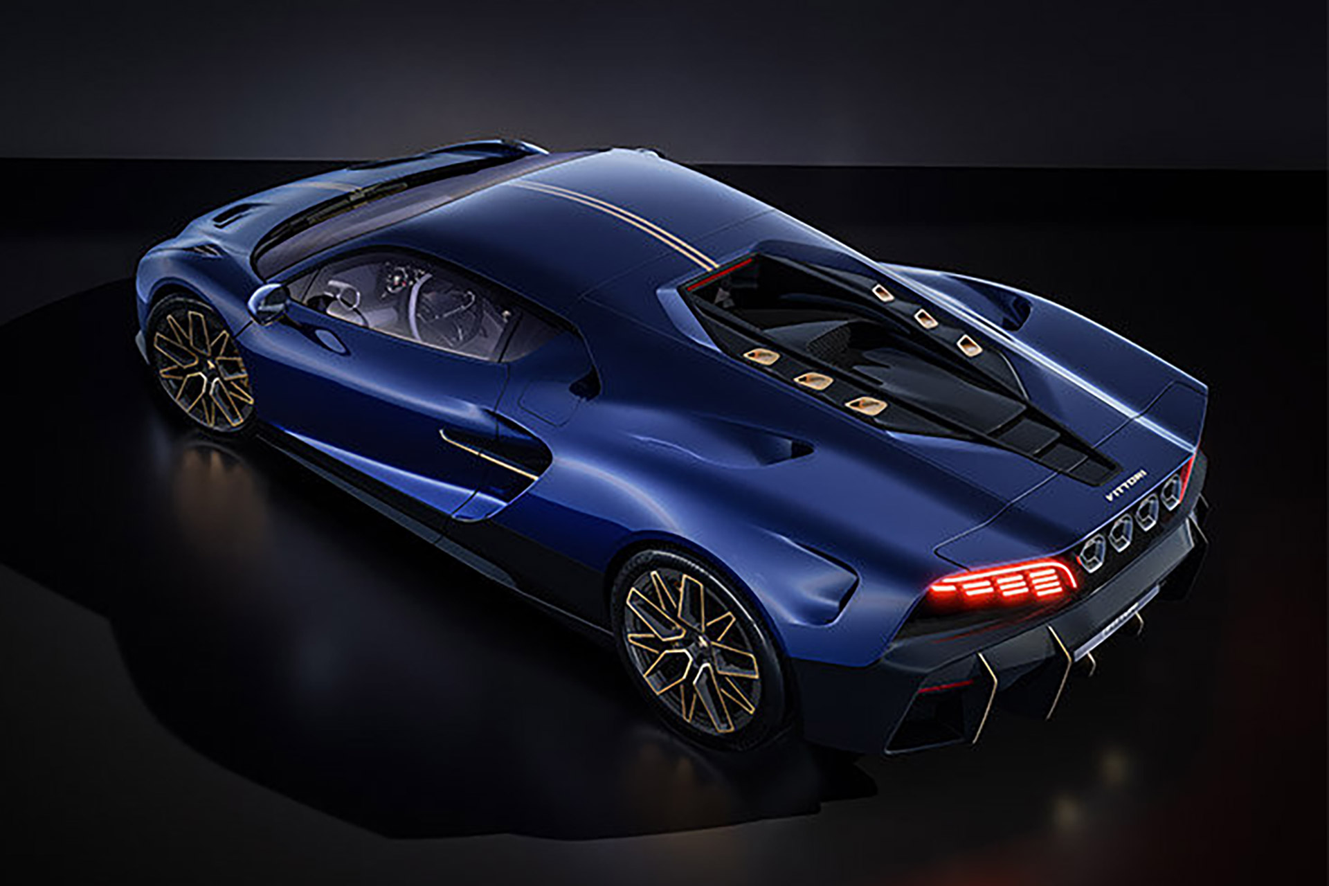 أما الجزء الخلفي، فهو أكثر حيوية. تحيط المصابيح الخلفية ذات الزوايا الجريئة بفتحات عادم رباعية في وسط المصد. ويمتد ناشر هواء ضخم بتفاصيل عمودية حتى قاعدة المصابيح، بينما تحيط لمسات برونزية بالسيارة، مما يبرز لون طلاء السيارة الأزرق الداكن الجميل. تقول شركة فيتوري إن حجم سيارتها الخارقة يُضاهي حجم سيارة لامبورغيني ريفويلتو تقريبًا.