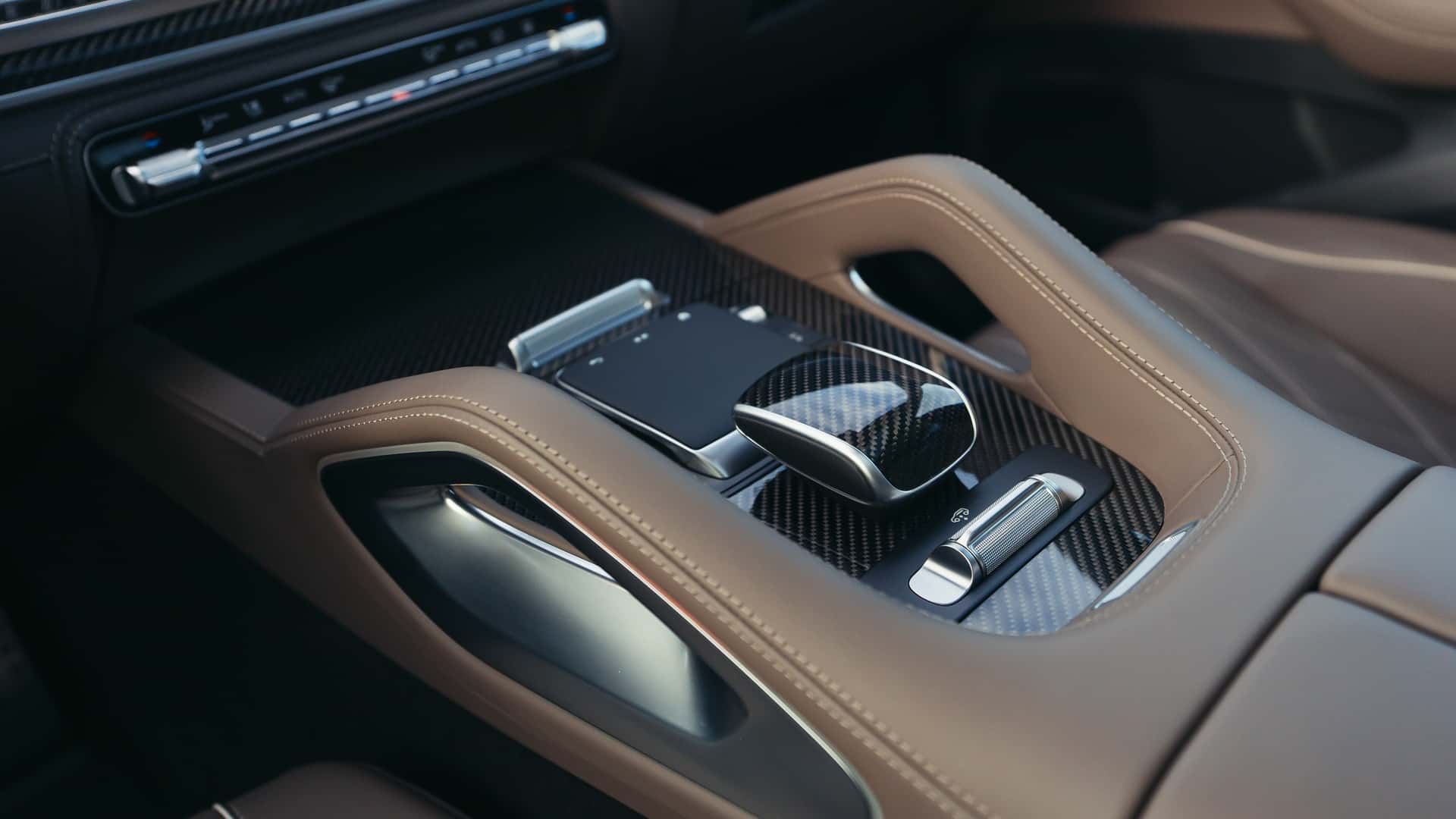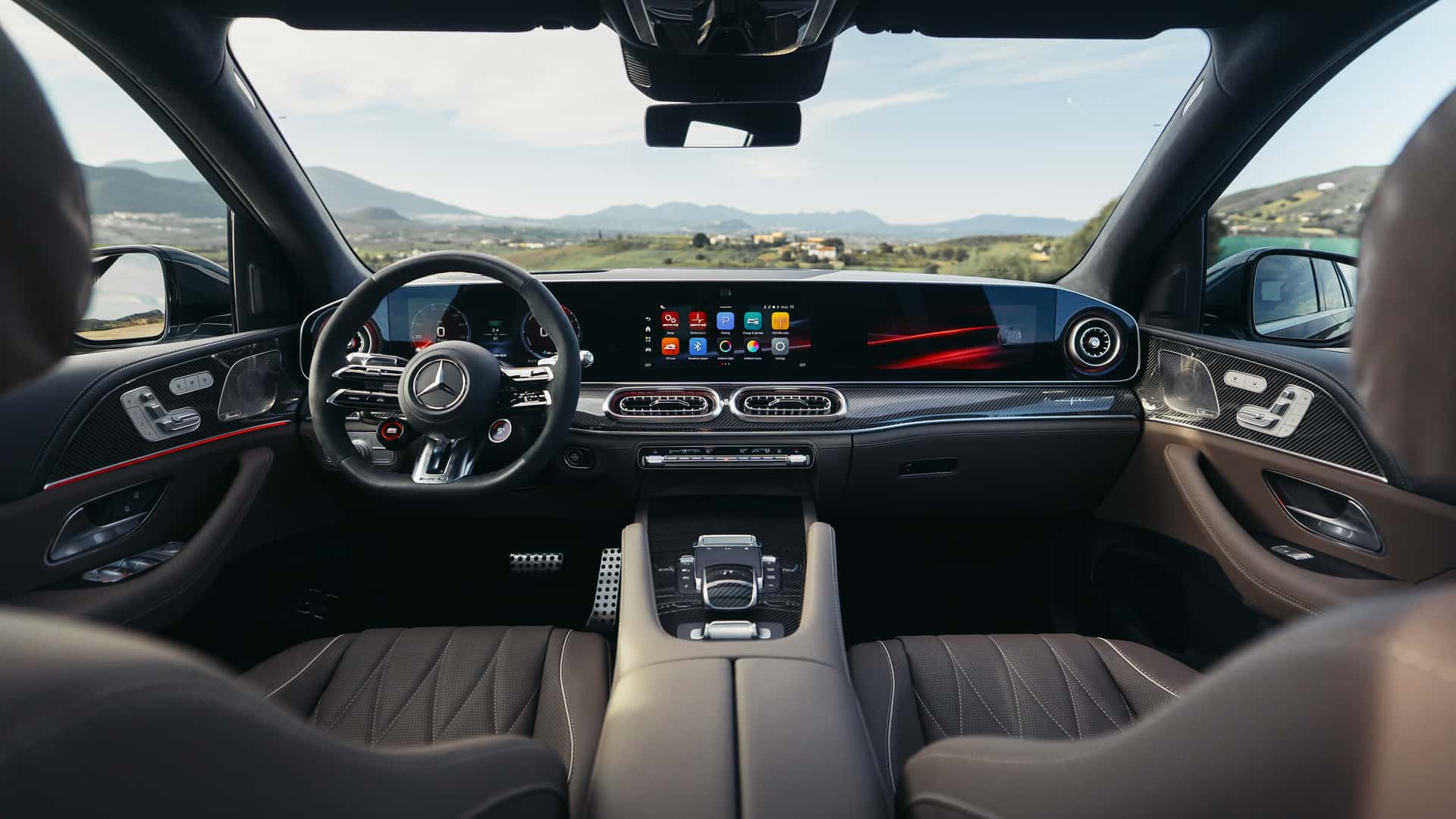 في الداخل، تأتي GLE قياسياً بشاشة Superscreen من مرسيدس، وهي عبارة عن ثلاث شاشات مقاس 12.3 بوصة موزعة على لوحة القيادة أسفل قطعة زجاجية واحدة، تعمل بنظام التشغيل الأحدث للعلامة التجارية. تقع الشاشات فوق فتحات تهوية مُعدّلة، لكن معظم المقصورة الداخلية تبدو دون تغيير، مثل الكونسول الوسطي.