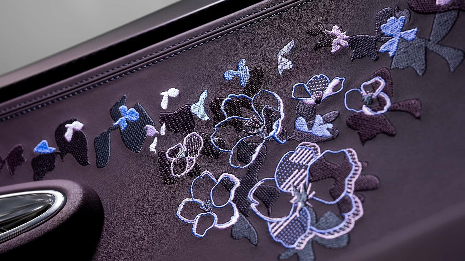 داخل سيارة ميسترال، تتجلى الفلسفة نفسها من خلال المواد المستخدمة وطريقة التنفيذ. جلد "بلان" و"مينوي"، ولمسات أرجوانية، وألياف الكربون، تخلق مقصورة داخلية راقية تتناغم مع التصميم الخارجي. يعود الطابع الزهري في التطريز، الذي تم ابتكاره بآلاف الغرز وتقنيات متعددة الطبقات لإضافة عمق وحيوية.