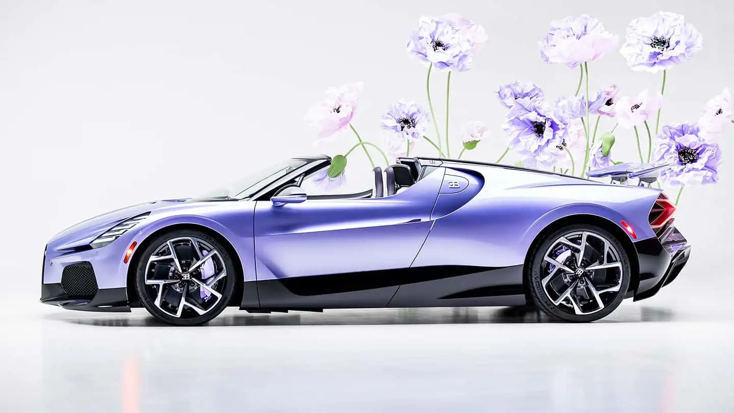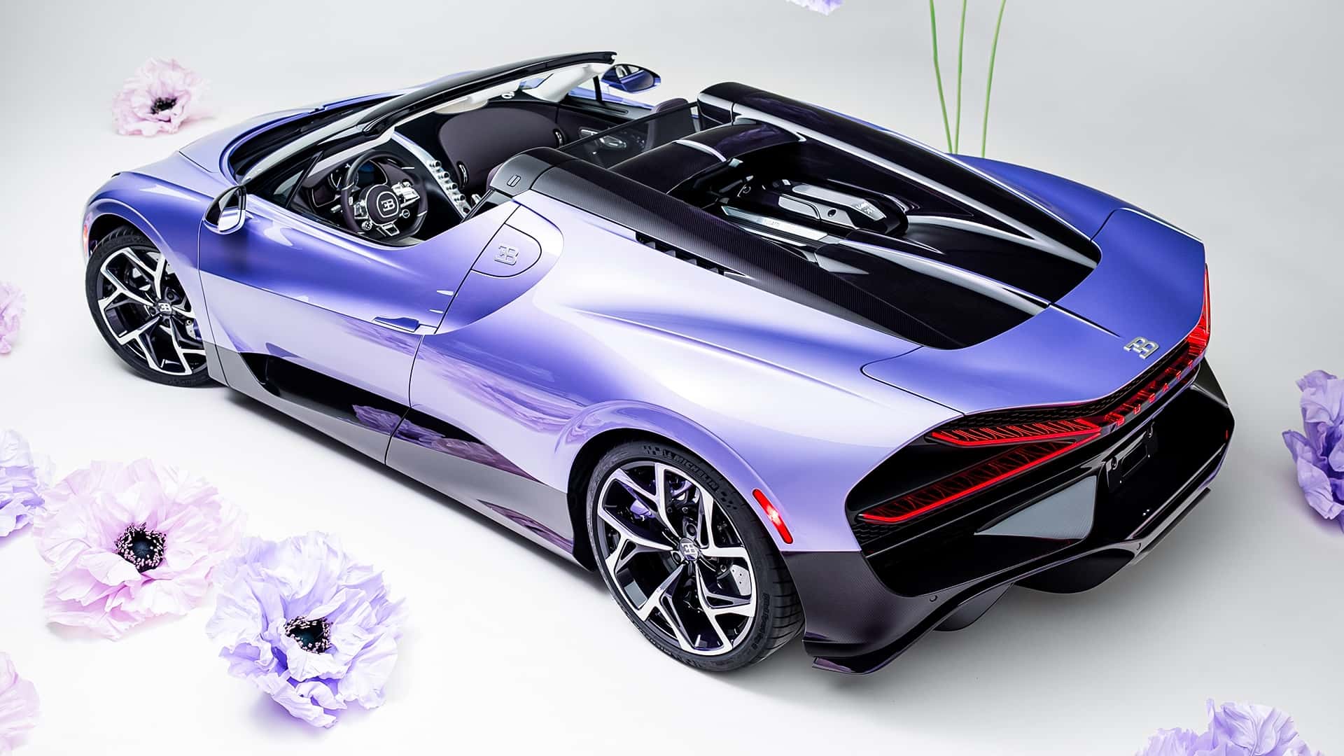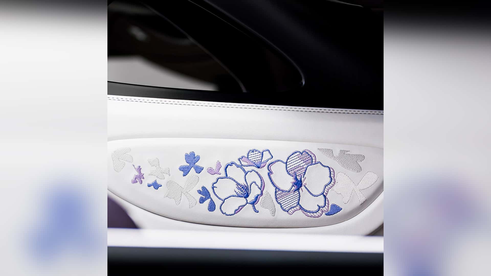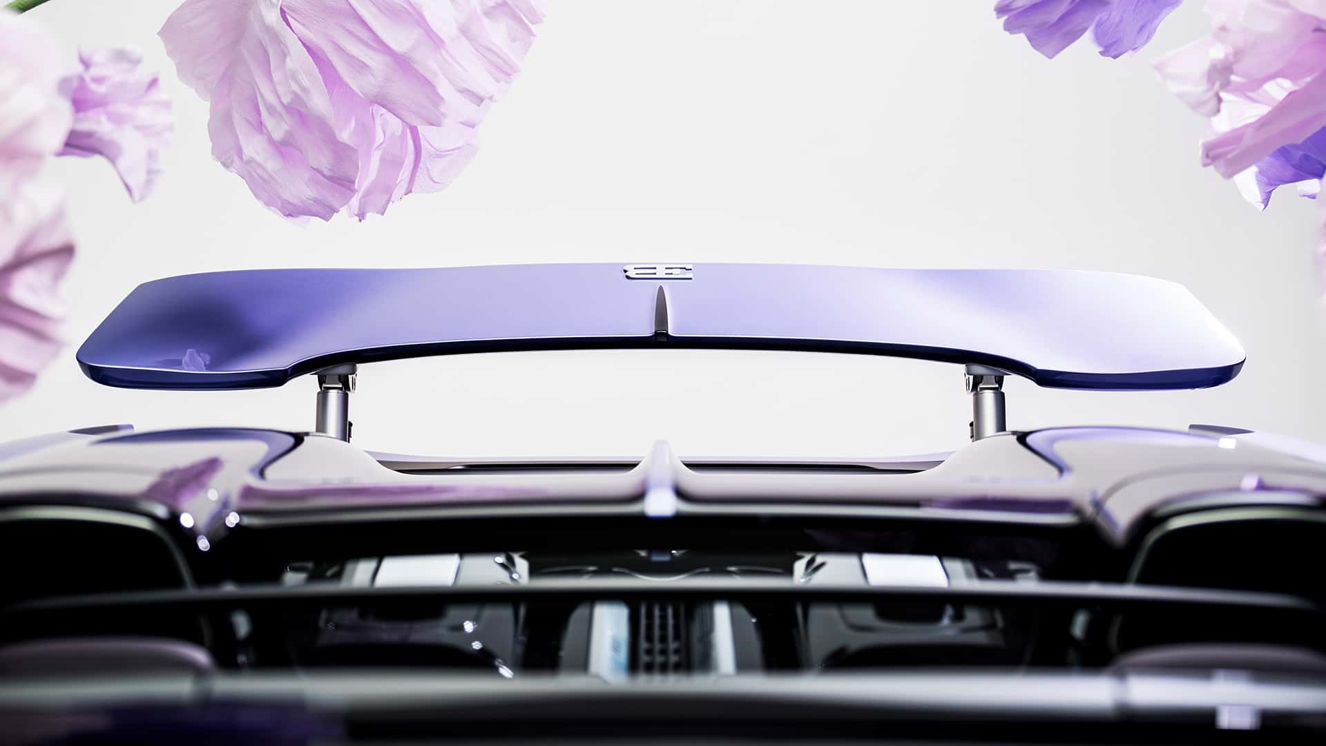 يبرز الطابع الزهري بشكلٍ جليّ في الجزء الخلفي من سيارة بوغاتي ميسترال. يتحول الجناح القابل للطي إلى لوحة فنية حقيقية: لوحة مرسومة يدويًا بتدرجات لونية من الليلكي والسوسن، تم تطبيقها عبر عملية معقدة من مراحل التغطية المتتالية. في المنتصف، يبرز اسم "كارولين"، رابطًا المشروع بأكمله بأعمق معانيه.