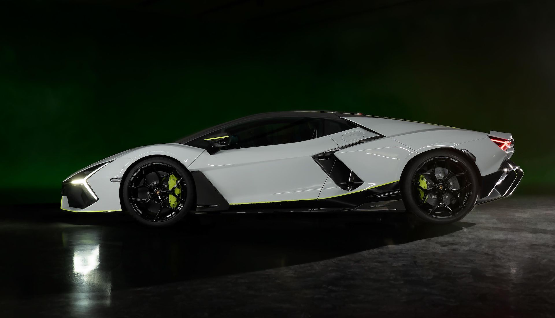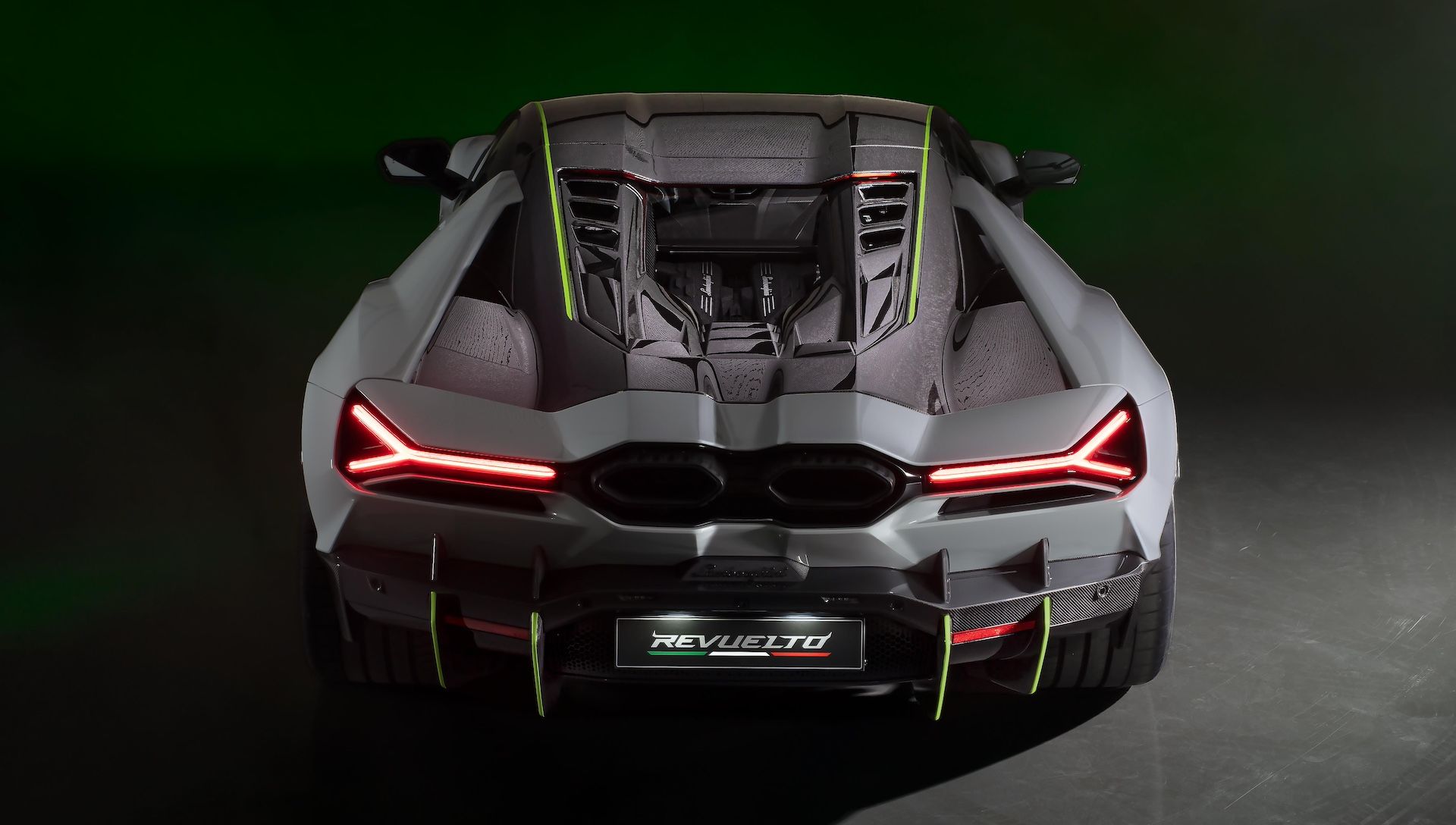 وبصرف النظر عن شعارات Lamborghini Arena 2024، تأتي سيارة Revuelto المخصصة مع عناصر متباينة من ألياف الكربون، بالإضافة إلى مزيج من Grigio Hati (الرمادي) مع تفاصيل في Verde Scandal (الأخضر) وخطوط السباق Nero Noctis (السوداء) على غطاء المحرك. يحمل الجزء الخلفي العلم الإيطالي بخطوط حمراء وبيضاء وخضراء على الجزء السفلي من الجناح المتحرك. وينتهي التخصيص الخارجي بعجلات Altanero سوداء لامعة مقاس 21 بوصة (أمامية) و22 بوصة (خلفية).
